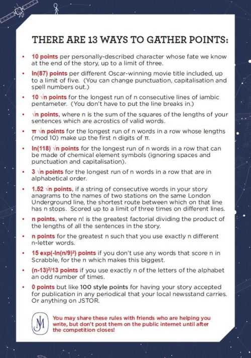 • 18 consecutive words forming digits of pi (starting: ‘say “I give’) (13.33 points)